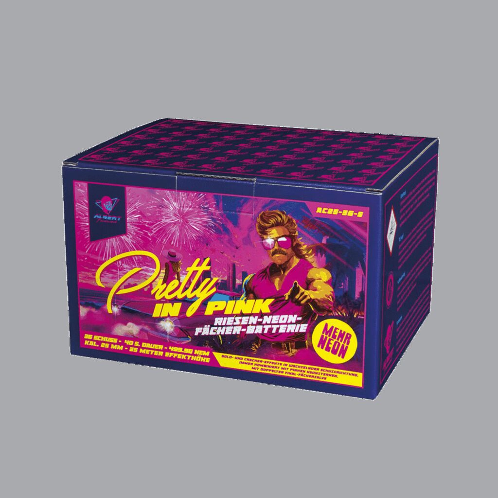 Pretty in Pink van Albert Feuerwerk is een batterij met 36 schoten in 25mm-kaliber met goud- en cracker-effecten in afwisselende richtingen, altijd gecombineerd met roze neonsterren, met een dubbele laatste waaiersalvo.